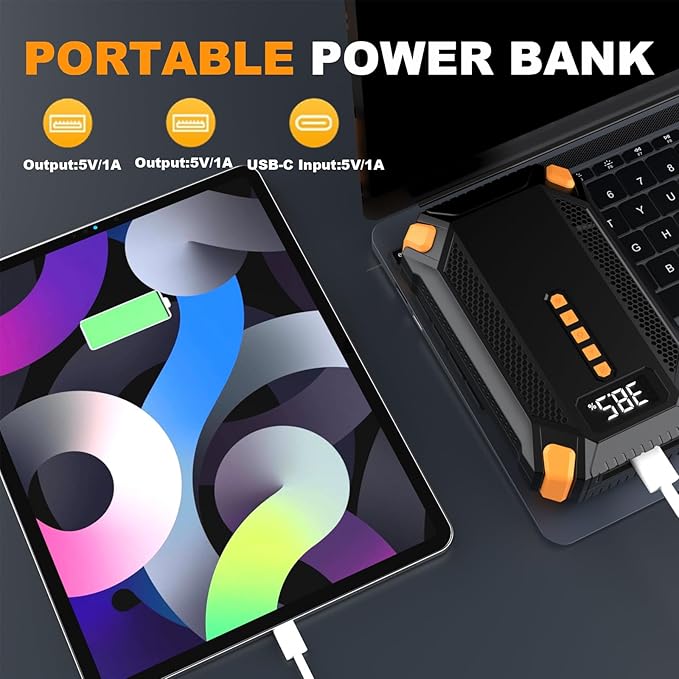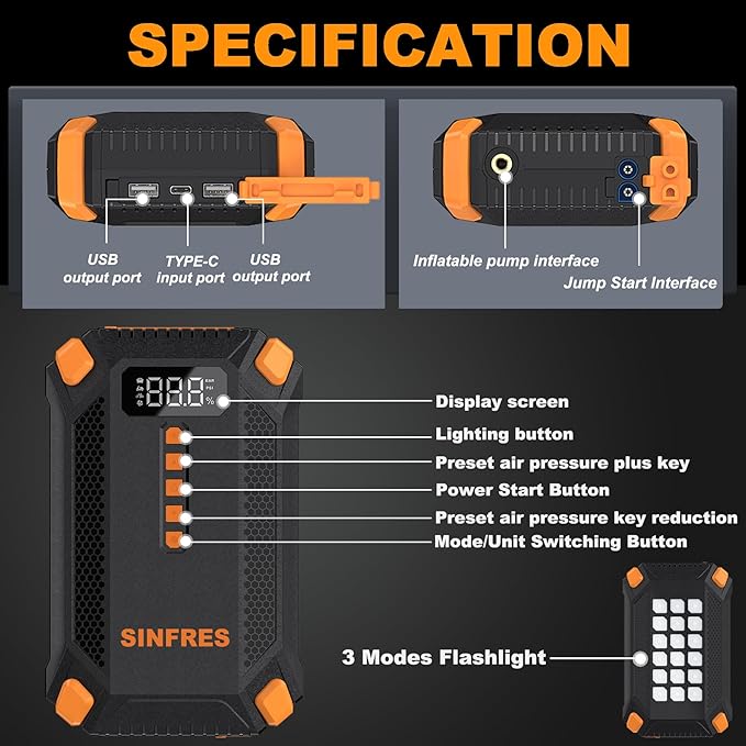 - 【Smart LCD Display & Triple Functionality】: The bright LCD screen clearly shows battery status, inflation progress and error alerts. More than just a jump starter - it's also a 10400mAh power bank (dual USB ports) and emergency flashlight with 3 modes (steady beam/SOS signal/strobe light) for any roadside situation.