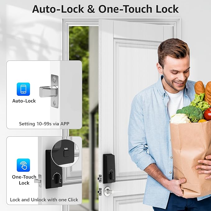 - 【Auto Lock & One-Touch Lock】Do not worry about forgetting to lock the door, the digital door lock can be set to lock automatically. The one-touch switch button helps you control the keypad door lock with handle set easily, no need to tediously enter the password when receiving guests, you can unlock the door with one key