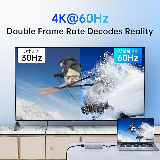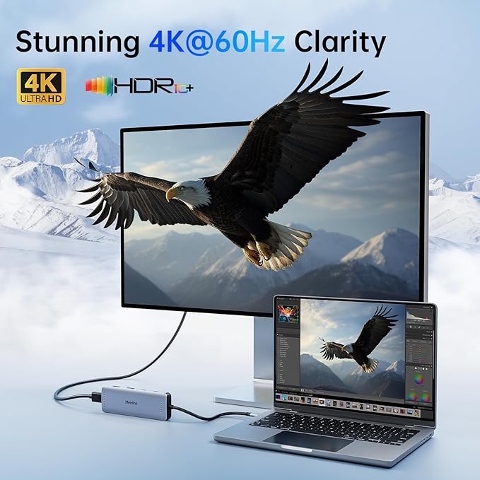 - 4K@60Hz USB-C to HDMI Hub: This Macbook pro air accessories delivers stunning 4K@60Hz (3840×2160) resolution, with downscaling support for 2K@120Hz and 1080P. This macbook adapter multiport allows to mirror or extend your laptop screens or monitors by connecting monitors tvs projectors with hdmi ports. Note: Your USB-C port must support video output (DisplayPort Alt Mode or Thunderbolt) for the adapter to function—otherwise, no signal will be transmitted.