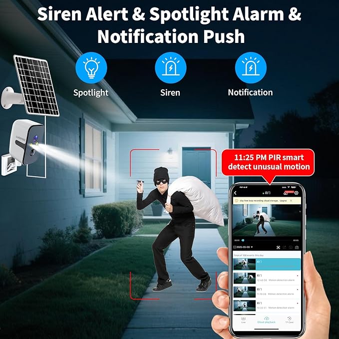 - 【PIR/AI Motion Detection & Siren Alarm & 2-Way Audio】: Built-in PIR motion sensor, this outdoor camera supports AI-powered human detection with adjustable sensitivity levels, reducing false and unnecessary alarms. It also features a microphone and speaker that supports real-time, two-way audio calls, you can communication with your family members or visitors, no matter where you are. In addition, you can have the device sound an alarm in the app to chase away unwanted guests and keep your home safe.