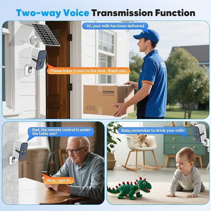 - 【IP65 Waterproof, Multi User Sharing】Solar powered camera have an IP65waterproof design, ensuring that they can still work properly in rainy weather conditions. They also support multi user sharing, so family members can share monitoring perspectives. For elderly people, children or pets who need care, family members can always understand the situation through shared perspectives to ensure the safety of the whole family.