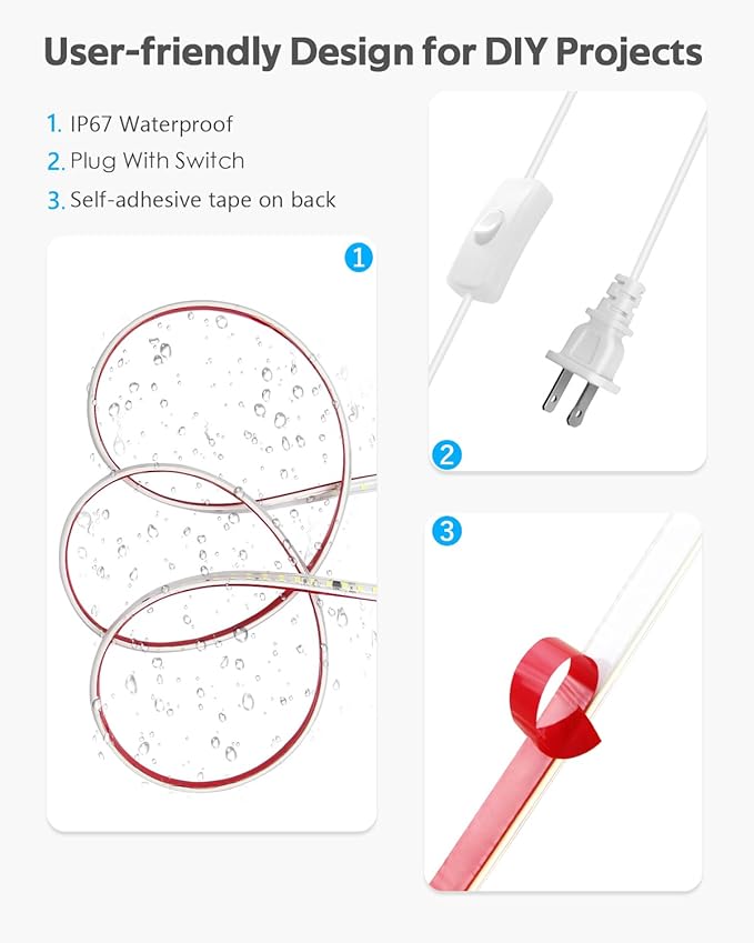 - 【Waterproof LED Strip Light Outdoor】Waterproof IP67. The outer layer of the light strip is wrapped in a PVC silicone sleeve, making it more waterproof and dustproof. It can effectively resist water vapor and dust, greatly extending the service life of the light strip and making it more reassuring to use. However, the power plug is not waterproof, and if used outdoors, waterproof measures need to be taken!!! And the light strip cannot be kept in water all the time×××