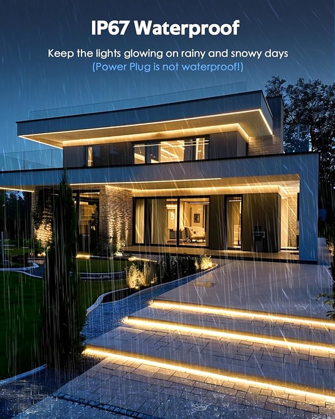- 【Waterproof LED Strip Light Outdoor】Waterproof IP67. The outer layer of the light strip is wrapped in a PVC silicone sleeve, making it more waterproof and dustproof. It can effectively resist water vapor and dust, greatly extending the service life of the light strip and making it more reassuring to use. However, the power plug is not waterproof, and if used outdoors, waterproof measures need to be taken!!! And the light strip cannot be kept in water all the time×××