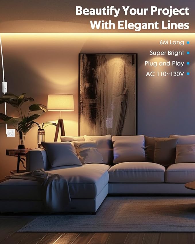 - 【Ultra Bright LED Strip Light】Compared with low-voltage LED strips, 110V-130V high-voltage led strips light use advanced high-voltage AC technology to provide higher brightness and more uniform lighting effects, completely eliminating dark areas and creating a bright and comfortable spatial atmosphere. In addition, it can be directly connected to AC 110V-120V household power supply, plug and play. During use, there is no voltage drop and the brightness remains consistent from start to finish.