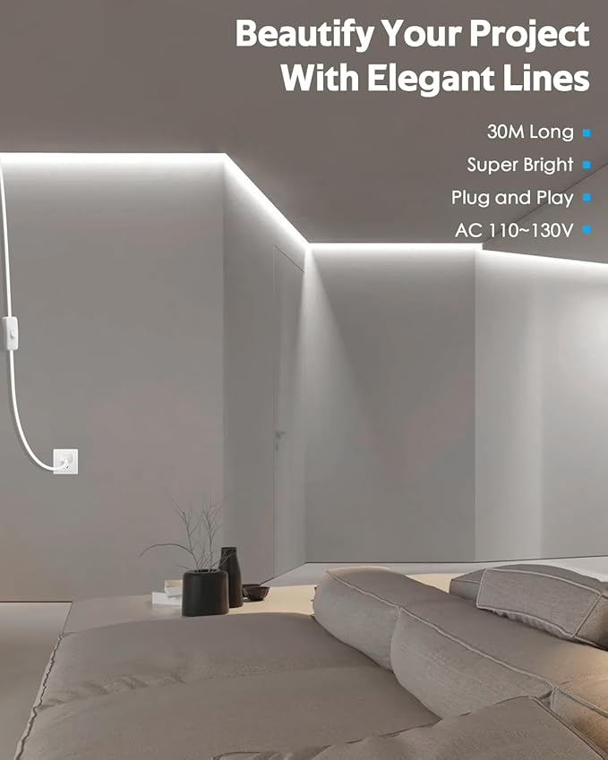 - 【Ultra Bright LED Strip Light】Compared with low-voltage LED strips, 110V-130V high-voltage led strips light use advanced high-voltage AC technology to provide higher brightness and more uniform lighting effects, completely eliminating dark areas and creating a bright and comfortable spatial atmosphere. In addition, it can be directly connected to AC 110V-120V household power supply, plug and play. During use, there is no voltage drop and the brightness remains consistent from start to finish.