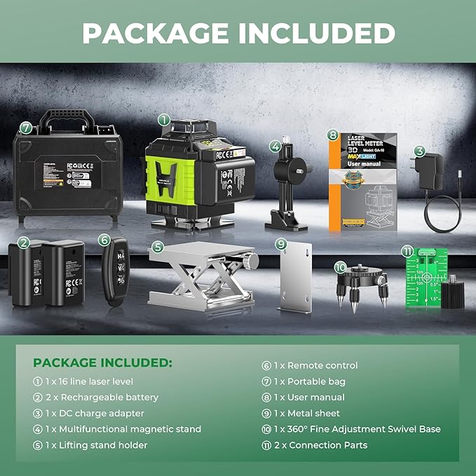 - 【Durable Design/Packaging List】IP54 waterproof/dusterproof to ensure that you can work normally and stably under complex working conditions. 1x 4D 16 Lines Laser Level, 1x Carry Bag, 1x Power Charger, 1x 1/4”Tread Mount, 1x 5/8-20" Tread Mount, 1x Wall Iron, 1x User Manual, 1x Remote Control, 1x Green Target Plate, 1x Wall Bracket, 1x Lifting Platform, 2x 2400mAH Batteries.