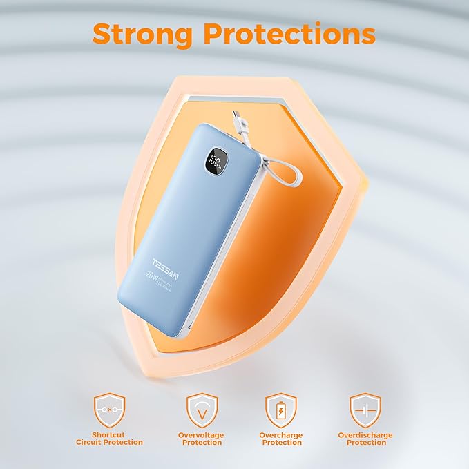 - Portable Phone Charger Built in Cable & Wall Plug: Conveniently charge your devices and the power bank for iphone itself with built-in cables and USB-C port. The integrated AC wall plug eliminates the need to carry additional adapters and cables,TESSAN battery pack simplifying your charging routine.