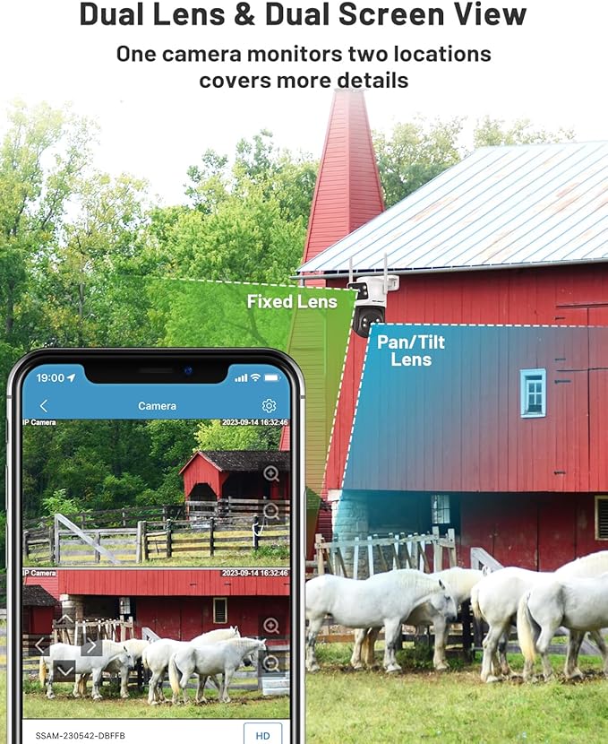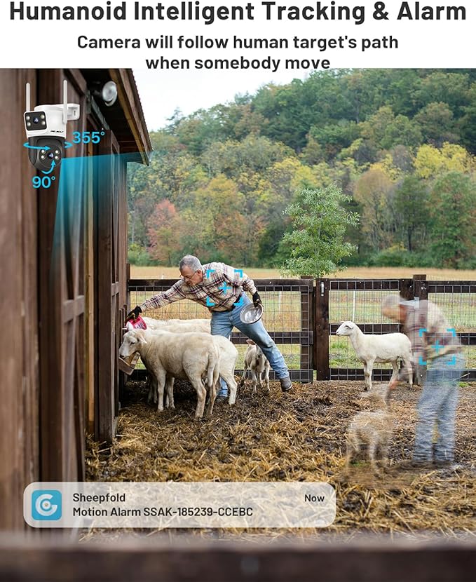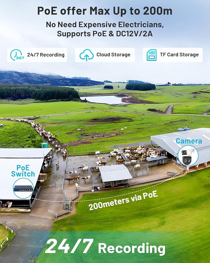 - 【Full-Color Night Vision】Unlike traditional black-white IR cameras, this dual lens non wifi security camera captures vivid color footage even in near-total darkness. Perfect for monitoring driveways, ranches, or dimly lit warehouses.