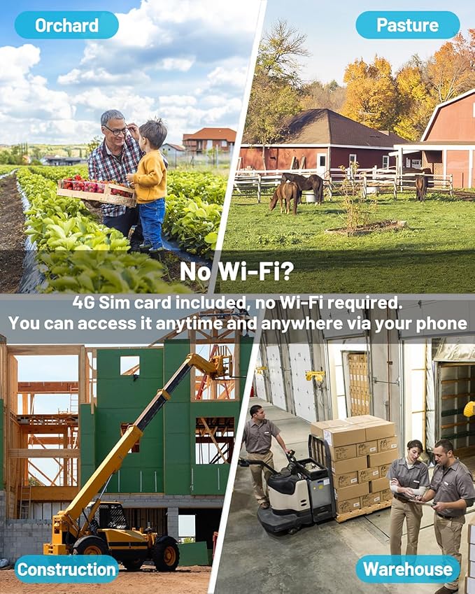 - 【Cloud Storage & TF Card Option】The dual lens outdoor cellular security camera offers dual storage flexibility: (1) Free 7-day cloud storage trial with unlimited capacity for critical event backups, accessible remotely even if the 4g sim camera goes offline; (2) Up to 128GB (not included) microSD for local loop recording with audio, automatically overwrites old footage to save costs.