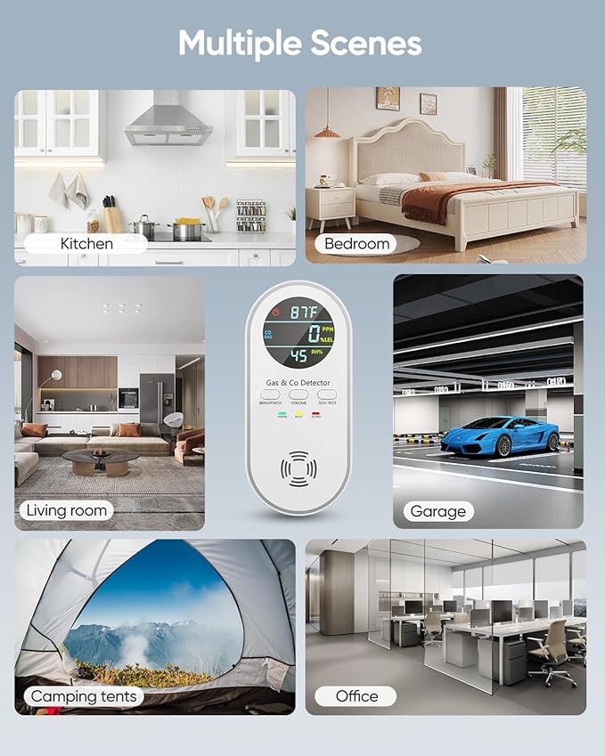 - 5-in-1 Detectors - Real-time monitoring of carbon monoxide(PPM), combustible gas (%LEL), temperature(°F), humidity(RH%) and Backup Battery.