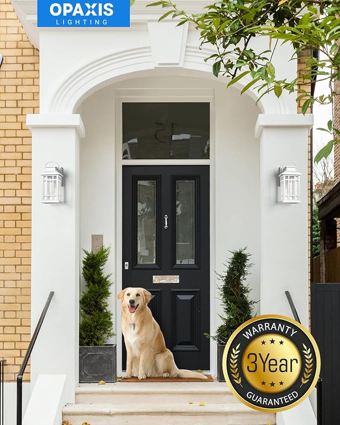 - Modern & Elegant Design: With a sleek white finish and seed glass, our automatic outdoor wall lights blend timeless charm with modern flair. They cast a stunning glow, adding a refined touch to any exterior. Perfect for garages, porches, and more – their metal-and-glass combo complements all styles.