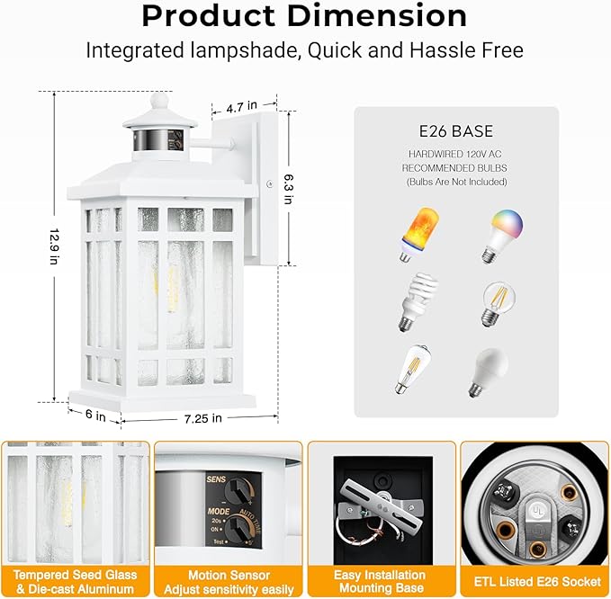 - Easy Instruction and E26 Socket: Ready to go right out of the box – our outdoor wall light comes fully assembled, no setup needed. Its E26 socket fits all standard bulbs; for best results with garage fixtures, we suggest 6~8w dimmable LEDs to avoid flicker (bulbs not included).