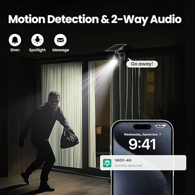 - High-capacity Battery & Solar Powered: With built-in 9000mAh High-capacity rechargeable battery, the outdoor security camera can work independently regardless of a sudden poweroff. S600 4G wire-free security camera can get non-stop solar power supply from Solar Panel.You’ll never need to dismount the camera for recharging or worry about dead batteries.