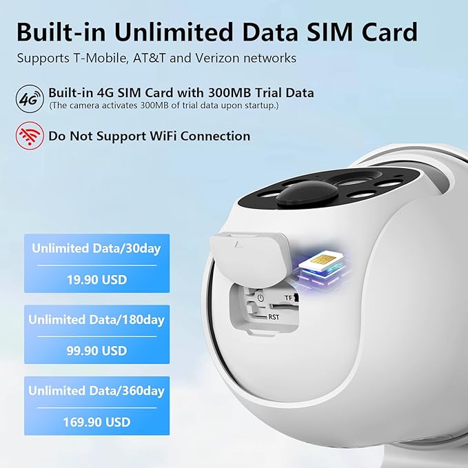 - No WiFi Needed & 4G LTE Connection: Cinnado no wifi security camera supports 4G LTE connection, making it suitable for off-grid locations, such as farm, warehouse, vacation home, jobsite, RV etc. The security cameras wireless outdoor has built-in a 4G LTE SIM card with 300MB of trial data, when the trial data runs out, you can renew the unlimited data plan on the app for $14.99 per month to $149.99 per year (one plan per camera). Please note that the 360 camera doesn't support Wi-Fi connection.