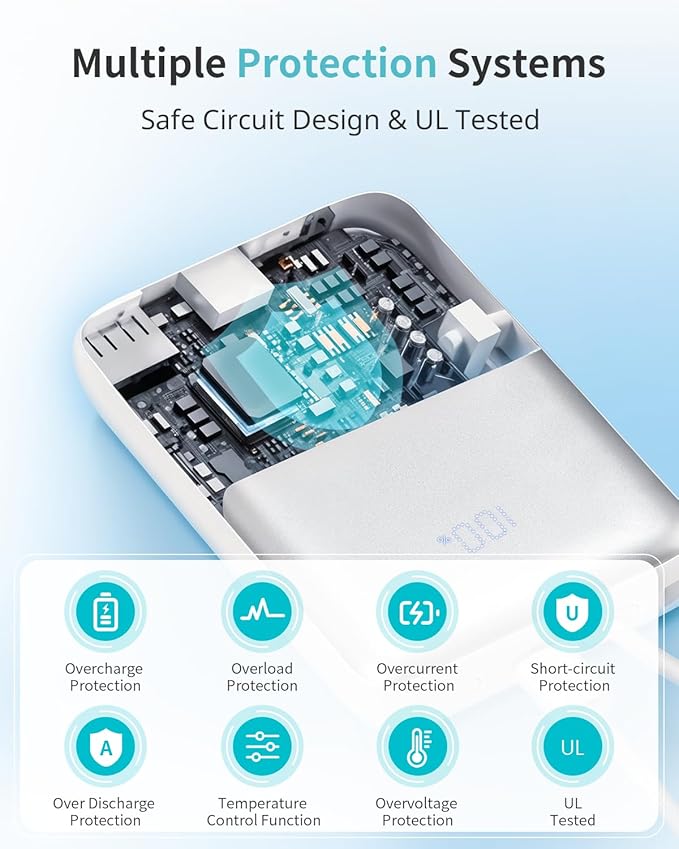 - Your Power Bank’s Anti-Danger Barrier: UL tested and built with a 7-layer protection mechanism, this portable battery defends against overcurrent, short-circuit, overload, overcharge, overdischarge, overvoltage, and temperature spikes. Whether at home, on the road, or in harsh environments, every charge comes with built-in peace of mind—no compromises on safety, no matter the situation.