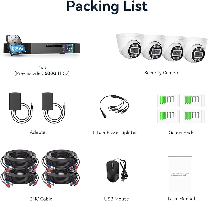 - Pre-Installed 500G HDD: Enjoy local storage on the hard drive, providing ample space for your video footage without any monthly fees. This ensures comprehensive and secure video storage with no hidden costs. You can set up 24/7 Recording and view playback video anytime