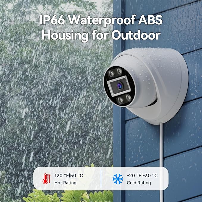 - Weatherproof Cameras for Outdoor Use: Each camera in this security camera outdoor system features durable IP66 ABS housing, built to withstand rain, snow, and heat. Perfect for your yard, garage, driveway, or porch—this CCTV surveillance kit works reliably in any season
