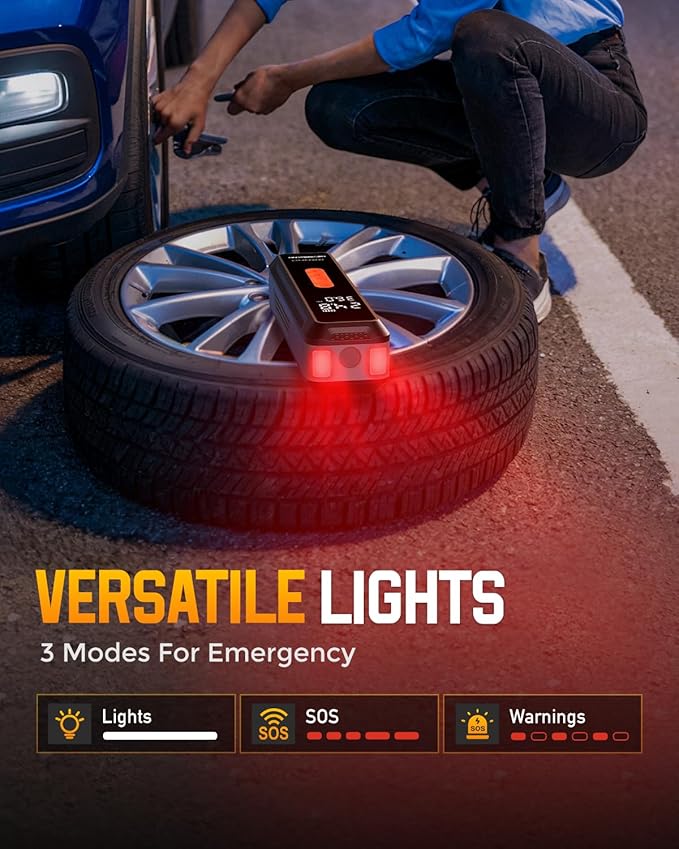 - 【Compact & Multi-Functional Companion】 Small but mighty, this air compressor features an emergency LED light and USB-C port, doubling as a power bank. Easily stored in your trunk or backpack, it’s a must-have tool for road trips and daily drives.