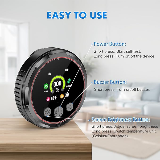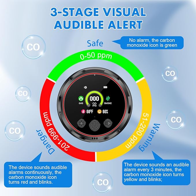 - 【5-in-1 Upgraded Carbon Monoxide, Smoke and Natural Gas Detector】This Chyuuie 5-in-1 carbon monoxide and propane gas detector integrates carbon monoxide, combustible gas, smoke, temperature and humidity sensors, which is easy to carry around and detects gases in the environment in real time to ensure our safety.The built-in 1000 mAh rechargeable battery ensures that this smoke and carbon monoxide alarm will continue to work in the event of a power outage.