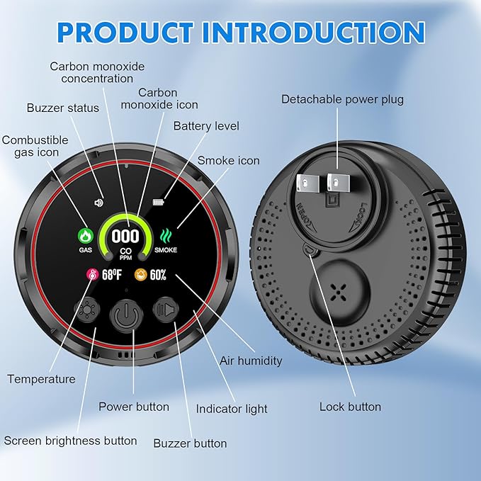 - 【Multi-functional Gas Alarm】The carbon monoxide detector is designed for home use and can detect a wide range of flammable and explosive gases, including liquefied petroleum gas (methaneCH4), compressed natural gas, natural gas, liquefied petroleum gas (LPG), ethane (C2H6), propane (C3H8), butane (C4H10), etc., temperature and humidity as well as carbon monoxide smoke, real-time detection of ambient gases for our safety.
