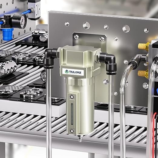 - 【Package included】1x Compressed Air Filter, 1x Nickel-plated Iron Air Plug, 1x Nickel-plated Iron Air Coupler, 2 x 3/4"Male Pipe, 2x 5 Micron Filter Element, 1x Teflon Tape.