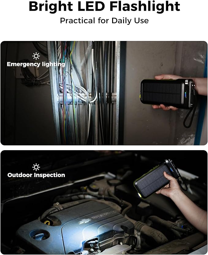 - [Advanced Wireless Charging] This solar charger power bank supports advanced wireless charging, compatible with all Wireless-enabled mobile devices. Such as iPhone 16/15/14/13 series, Samsung Galaxy S23/S22/S21 series, etc. Put your device on the wireless charging area, it gets charged immediately. Come and enjoy your cable-free charging time.