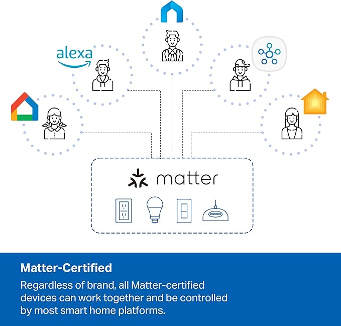 - ๐๐๐ญ๐ญ๐๐ซ-๐๐๐ซ๐ญ๐ข๐๐ข๐๐ ๐๐จ๐ซ ๐๐ง๐ข๐ฏ๐๐ซ๐ฌ๐๐ฅ ๐๐จ๐ฆ๐ฉ๐๐ญ๐ข๐๐ข๐ฅ๐ข๐ญ๐ฒ - Matter-certified devices, regardless of brand, can work together and are can be controlled through most major smart home platforms like Alexa, Google Home, Apple HomeKit, and Samsung SmartThings.