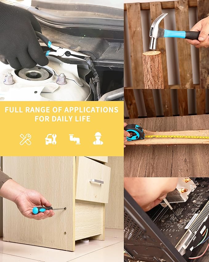 - Essential for Home, Auto, & Emergency Repairs: This versatile tool kit is ideal for home maintenance, car repairs, and emergency fixes. It includes a range of screwdrivers, hex keys, wrenches, and a claw hammer for home projects, plus essential tools for car emergencies, such as a tape measure, utility knife, and pliers. The included safety gloves and magnetic bit holder add extra convenience for precise repairs. Whether tackling assembling furniture, or handling unexpected breakdowns