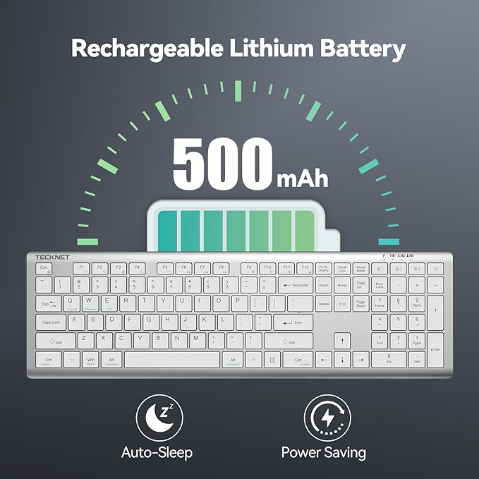 - 【Rechargeable Convenience】 The TECKNET rechargeable keyboard has a built-in 500mAh large-capacity rechargeable battery, which means no more frequent battery changes, lasting up to 180 days on a single 2-hour charge (based on 2 hours of daily use). The keyboard wireless automatically enters sleep mode after 30 minutes of inactivity and wakes up instantly with any key press, ensuring no delays in your work.