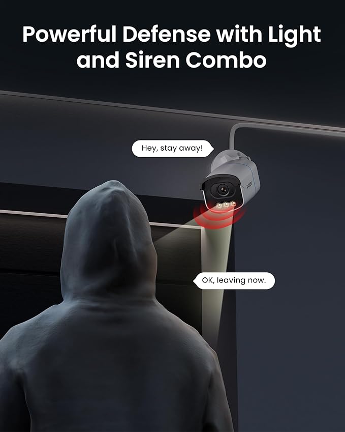 - (3). [ Proactive AI Security with Dual Deterrents ]__ Stop threats before they escalate: Advanced AI analyzes movement patterns to distinguish people/vehicles with 98% fewer false alarms than basic motion sensors. Triggers instant alerts, a 110dB siren, and flashing spotlights to scare off intruders—unlike passive cameras that only send notifications.