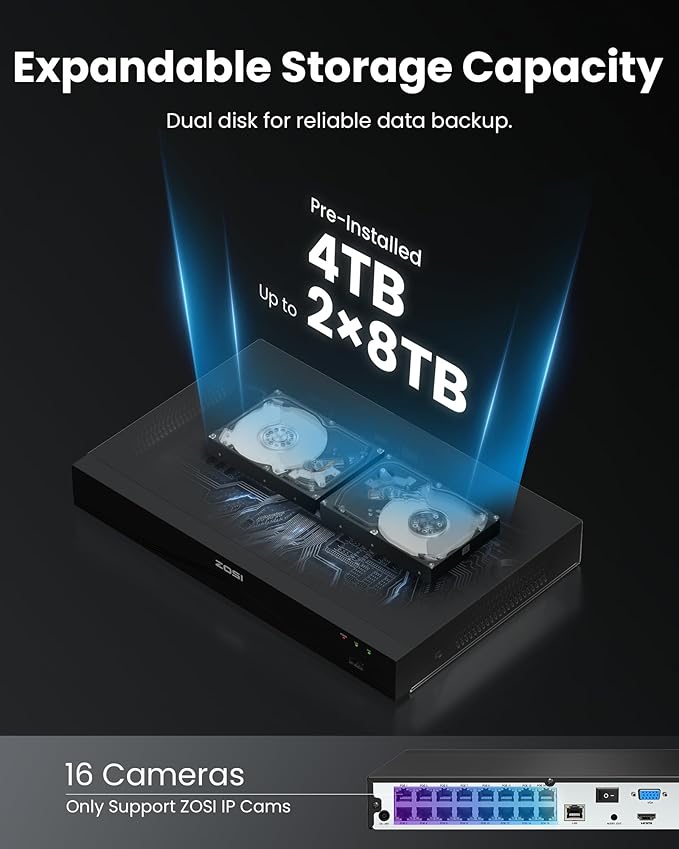 - (4). [ Seamless Remote Monitoring & Instant Communication ]__ Control your system anytime via the ZOSI Smart App: Stream live video, review recordings, or use crystal-clear two-way audio to greet visitors, warn trespassers, or calm pets. PoE ensures rock-solid connectivity without Wi-Fi dropouts—ideal for rural or high-interference areas.