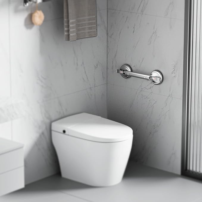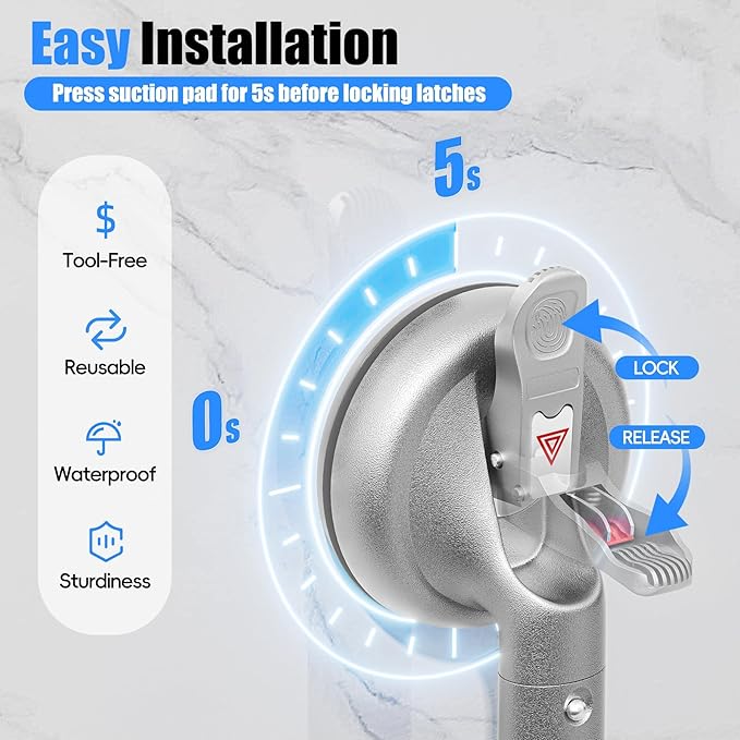 - EASY INSTALLATION: Press the shower grab bar on the wall for 5 seconds, then lock the latch to complete the installation, no tools, no drilling, no damage to the wall. Removable and reusable. After use, remove and clean the suction cup surface, next time you install it, you can adjust the position according to the current need, so that the shower bar can be attached to the wall for a longer time. (Please make sure the surface is clean and dry before installation)