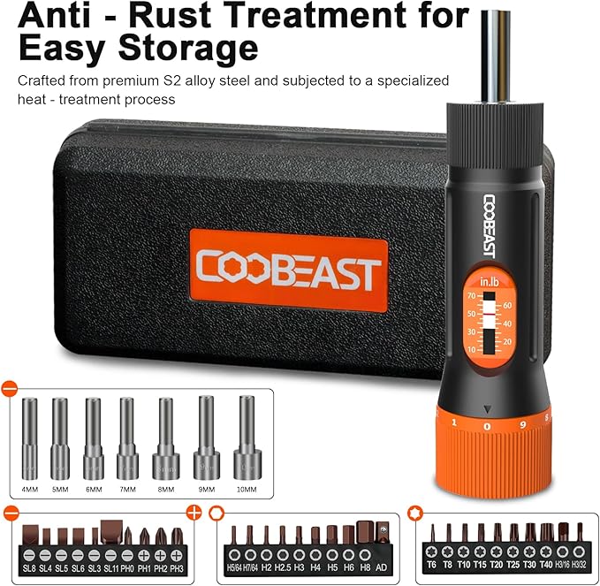 - HIGH ACCURACY SCREWDRIVER - Coobeast preset torque screwdriver offers a torque range of 10-70 in-lbs with a torque increment of 1 in-lbs. Accuracy of +/- 2 in-lbs. Clearly main display screen and scale are easy to read. Strong identification redline alignment scale line combines the bottom subscale value to provide the final value and avoid read errors. High accurate and easy to operate.