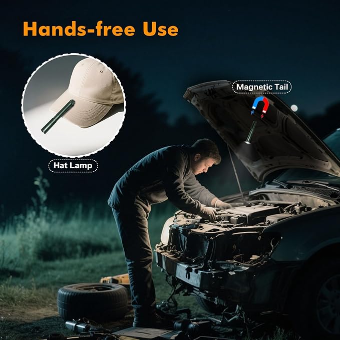 - Hands-Free Versatility:Multi-position clip securely mounts on hat brims for hands-free illumination, while the magnetic tail cap converts any metal surface into an instant work light. Perfect for mechanics, campers, repair, operation, warehouse.