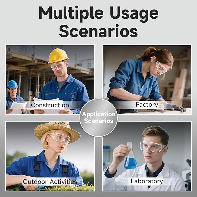 - Safety Glasses Bulk: Inside the package are 10 pack safety goggles over glasses and 10pcs safety glasses wipes. These safety goggles anti fog come individually packed with a cloth to wipe the surfaces.These anti fog safety glasses are perfect for construction, woodworking, sculpting, diy, weeding, indoor or outdoor family activities, and any other scenario where eye protection is needed