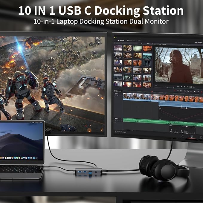 - 【10 in 1 USB C Docking Station】This USB-C docking station transforms your laptop into a complete workstation. The dual HDMI adapter features Dual 4K HDMI (4K@30Hz single display), 100W PD charging, USB 3.0 (5Gbps), 2× USB 2.0, SD/TF card slots, and a 3.5mm audio jack—perfect for video output, fast file transfer, device connection, and high-power charging.Declutter your desk and boost productivity with just one compact hub.