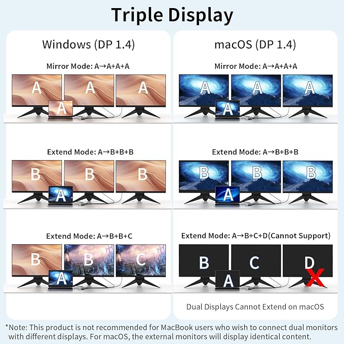 - 【Triple Display Docking Station & 4K Ultra HD】This USB C Hub supports MST/SST modes on Windows, allowing mirror or extended displays.Enjoy 4K@30Hz on a single HDMI,1080P@60Hz on dual monitos,Triple display (2×HDMI + 1×VGA) all at 1080P@60Hz.Ideal for multitasking, presentations, and video editing. Boost efficiency while enjoying sharp, immersive visuals.Note: macOS supports mirror mode only due to system limitations. For 4K output, your device must support DisplayPort 1.4, and use an HDMI 2.0+ cable with a 4K monitor. Devices with DP 1.2 (e.g. 2018 Mac mini) may be limited.