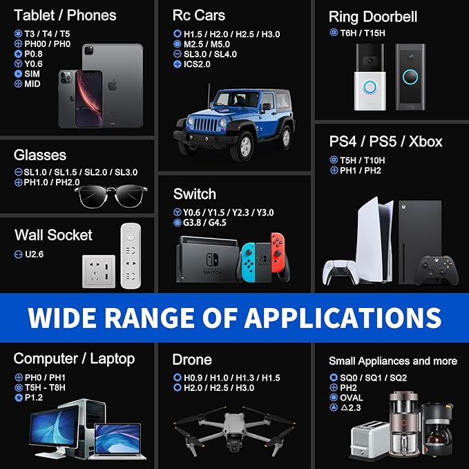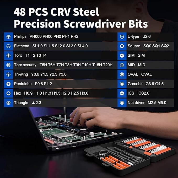 - 64-in-1 Precision Screwdriver Set: This small screwdriver set includes 48 bits (Phillips, Flathead, Torx, Torx security, Triwing, Pentalobe, Hex, Triangle, U-type, Square, SIM, MID, OVAL, Gamebit, Nut driver). It's a complete electronics repair kit that has been professionally designed to repair computers, PC, laptops, Macbooks, tablet, phones, PS4 PS5, XBOX, Switch, eyeglasses, drone, watches, Ring doorbells and more