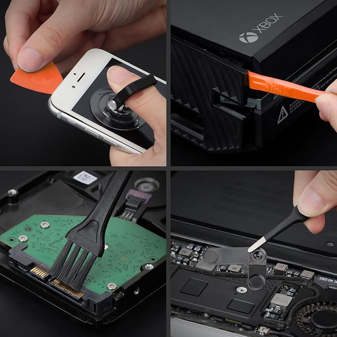 - Practical Accessories: Our electronics tool kit comes with 8 types of 15 essential accessories. Magnetizer can enhance the magnetism of the screwdriver tip, pointed tweezers make it easy to handle screws and tiny components, spudger and hook tool is effective for connecting/disconnecting components, scraping off adhesives, suction cup, pry tools, opening picks and brush to help open and clean your device
