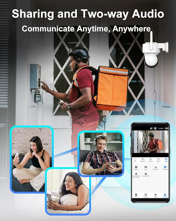 - 【Two-Way Audio & Family Sharing】 Communicate clearly with visitors or warn off trespassers using real-time two-way audio. Easily share camera access with family members, allowing up to 5 users to monitor your property simultaneously for collective peace of mind