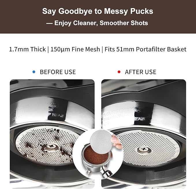 - Enhanced Extraction with Espresso Puck Screen 54mm: The reusable stainless steel espresso puck screen 54mm promotes even water flow and easy puck removal—a must-have 54mm espresso accessory for better-tasting coffee and easier cleanup