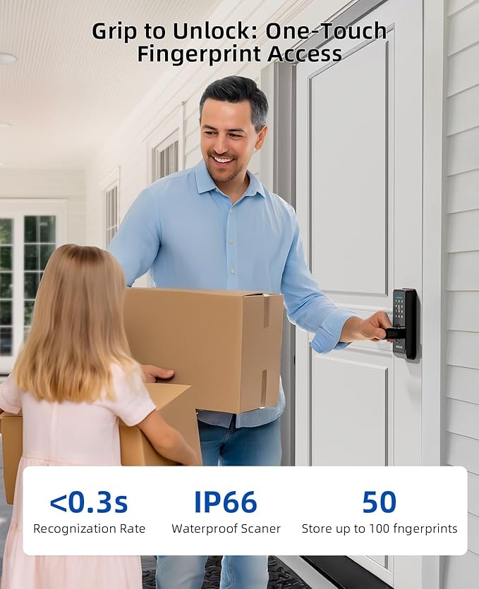 - 【Home Security】Our deadbolt smart lock made with sturdy aluminum alloy construction,Weatherproof(IP65),so you don't worry in all weather.Advanced 3D Fingerprint technical+anti-peeping user code protection+low battery indicator+ silent mode+an alarm triggers after 5 wrong attempts+auto-locking,Provides reliable home protection