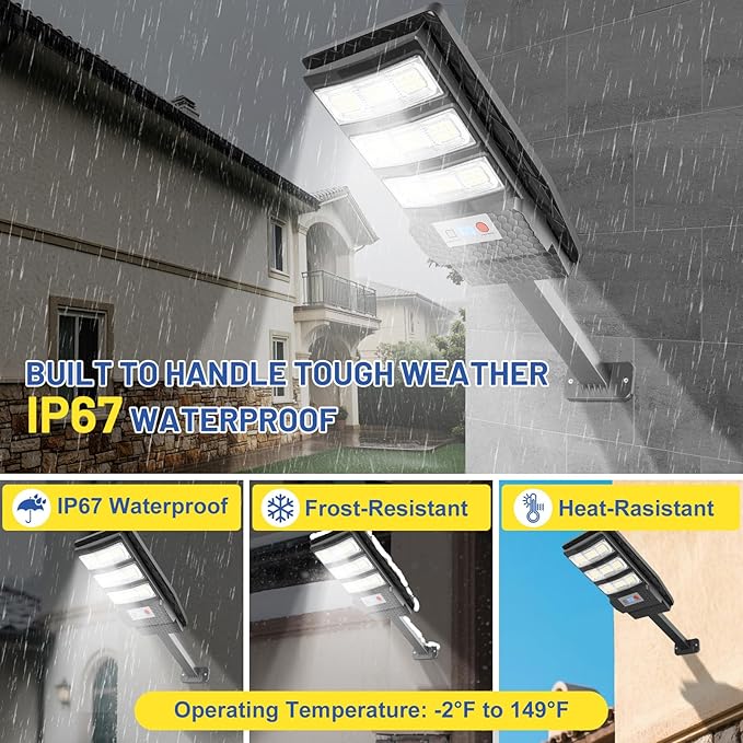 - BRIGHT & WIDE COVERAGE: Equipped with 81 high-lumen LEDs, this solar street light is designed for strong brightness and wide-area illumination — covering up to 500-1000 sq ft with a 240° beam angle. Suitable for driveways, yards, patios, garages, parking areas, barns, and outdoor sheds. Over 50,000-hour lifespan with low maintenance.