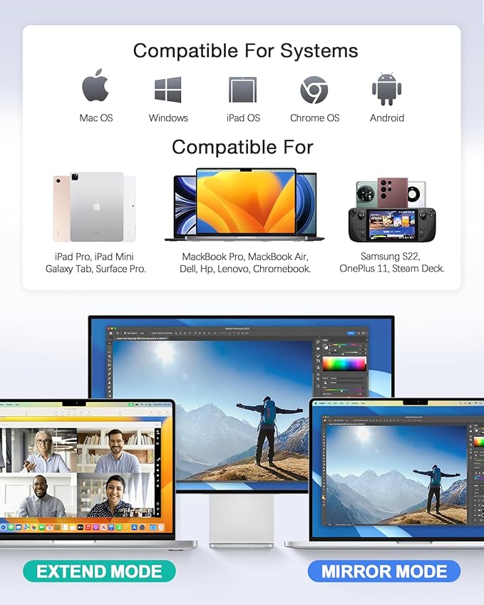 - Travel-Ready & Broad Compatibility – Slim aluminum shell (~2.4oz) fits your bag. Works with MacBook Pro/Air, Dell, HP, Lenovo, Surface, iPad Pro and other USB-C laptops/tablets/phones that support DP Alt Mode