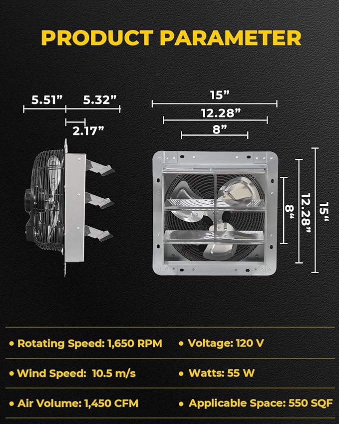 - POWERFUL AIRFLOW: VENTISOL 12 inch exhaust fan runs 1650 rpm with an airflow of 1450 CFM on high. Produces stronger and more powerful airflow for better air circulation in any areas.