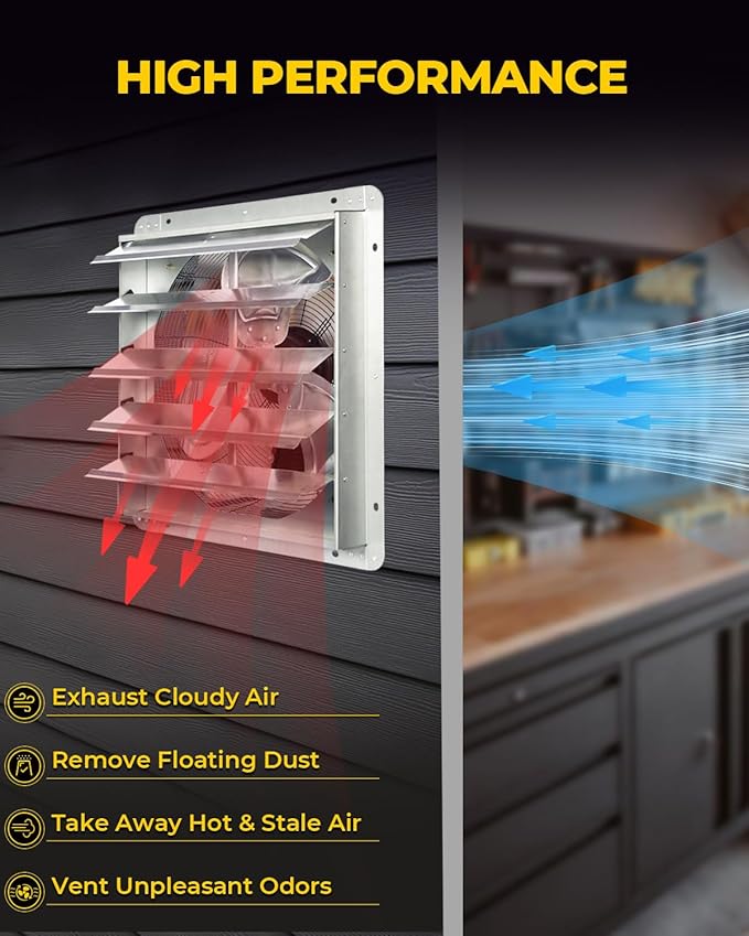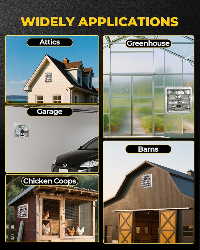 - MULTIPURPOSE: This shutter exhaust fan is designed to help remove excess heat and moisture, keeps your living space cooler and more comfortable year-round. Widely use in home attic, workshops, welding rooms, factories, warehouses, barns, and greenhouses.
