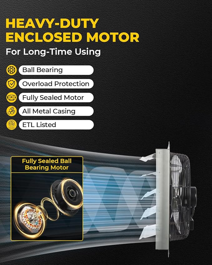 - AUTOMATIC ALUMINUM SHUTTERS: This wall mounted exhaust fan includes automatic gravity shutters that open and close with the operation of the fan. Protecting your shutter fan from rain and others when not in operation.