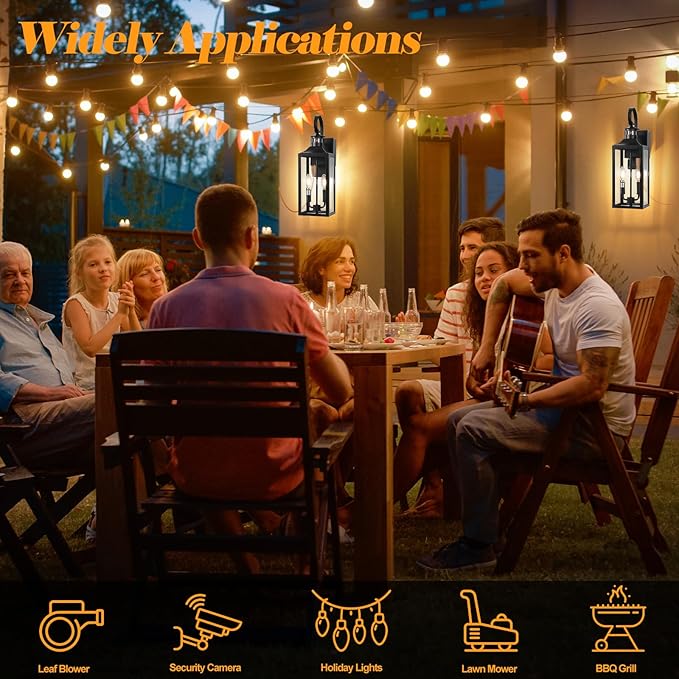 - 【Weather Resistant & Application】The dusk to dawn outdoor lighting features a sturdy metal frame, rust-resistant coating, and thickened clear glass to ensure long-lasting durability without rusting, corroding, or fading. It withstands all weather conditions—rain, snow, ice, or heat, maintaining its sleek and stylish appearance.The built-in GFCI outlet offers outdoor power supply for holiday lights, leaf blower, lawn mower, BBQ grill, porch fan. Ideal outdoor light for front door, patio, porch, garage, balcony, entryway, etc