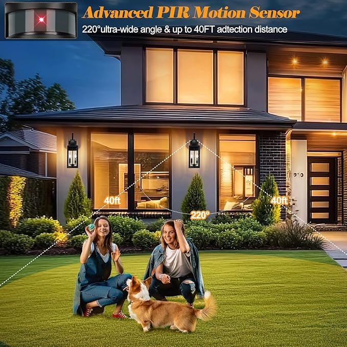 - 【Upgraded 3 Lighting Modes】The motion sensor outdoor light features an advanced PIR motion & dusk to dawn sensor with three modes: ①Dusk-to-Dawn Mode: the porch light will automatically turn on at dusk and off at dawn. ②Motion Mode: The outdoor sconce keeps off at night, once motion is detected, it reverts to 100% brightness and will revert to full off after 120 seconds without movement. ③Manual Override Mode: Keep full brightness at night for 8 hours, and automatically reverts to your previous setting mode. Easily slide the switch to adjust the modes