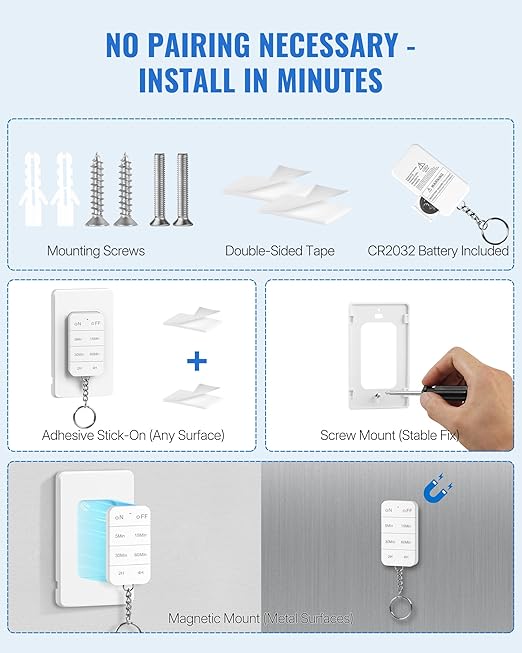 - Wireless & Magnetic Remote Switch: With a single tough of one button, you can remotely control lighting or household appliances without electrical wiring or hiring an electrician. The remote outlet switch has a magnetic base. You can secure the remote control outlet with timer anywhere convenient with the included adhesive strips or hardware. Plus, the wireless light switch comes with a keychain for easy portability wherever you go